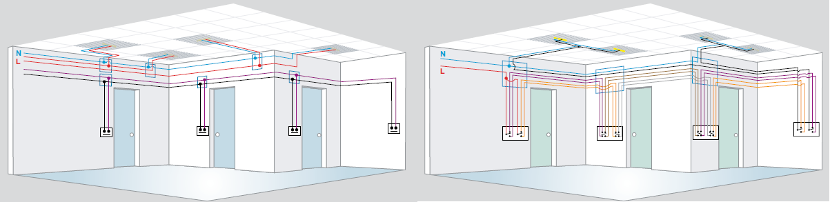 A comparison of the electrical plant done with pulse relay and the same installation performed by intermediate (cross) and two-way switches in the conventional way can be viewed in the following figure: